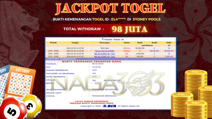 NAGA303 mengucapkan selamat kepada user id : EL4** yang telah berhasil mendapatkan jackpot pada permainan TOGEL di SYDNEY POOLS . Kemenangan sebesar Rp 98.000.000,-. telah dibayarkan LUNAS oleh pihak naga303 kepada pemilik user id setelah yang bersangkutan mengisi formulir withdraw. Proses pencairan dana berlangsung sangat cepat hanya dalam waktu 6-11 menit sudah berada dalam rekening pemilik user id. Bukti transfer yang dapat anda lihat adalah bukti SAH / VALID yang langsung di dapatkan melalui bukti transaksi dari Bank yang digunakan untuk pengiriman dana pada rekening pemilik user id. Terima kasih kami sampaikan kepada para pengguna setia naga303 yang telah menggunakan situs kami, sebagai Bandar Terpercaya yang pastinya membayar semua kemenangan member hingga lunas. Apakah Naga303 PENIPU ? Reputasi “NAGA303 TERPERCAYA” sudah sangat melekat. puluhan hingga ratusan ribu pengguna setia NAGA303 tetap menggunakan situs terbesar dan terbaik di Indonesia ini. Hapus rasa was-was dan khawatir anda, kemenangan anda berapapun PASTI dibayarkan hingga lunas.