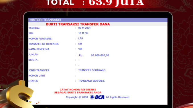 NAGA303 mengucapkan selamat kepada user id : IUD*** yang telah berhasil mendapatkan jackpot pada permainan LIVE CASINO DI SICBO DICE. Kemenangan sebesar Rp 63.900.000,-. telah dibayarkan LUNAS oleh pihak naga303 kepada pemilik user id setelah yang bersangkutan mengisi formulir withdraw. Proses pencairan dana berlangsung sangat cepat hanya dalam waktu 6-11 menit sudah berada dalam rekening pemilik user id. Bukti transfer yang dapat anda lihat adalah bukti SAH / VALID yang langsung di dapatkan melalui bukti transaksi dari Bank yang digunakan untuk pengiriman dana pada rekening pemilik user id. Terima kasih kami sampaikan kepada para pengguna setia naga303 yang telah menggunakan situs kami, sebagai Bandar Terpercaya yang pastinya membayar semua kemenangan member hingga lunas. Apakah Naga303 PENIPU ? Reputasi “NAGA303 TERPERCAYA” sudah sangat melekat. puluhan hingga ratusan ribu pengguna setia NAGA303 tetap menggunakan situs terbesar dan terbaik di Indonesia ini. Hapus rasa was-was dan khawatir anda, kemenangan anda berapapun PASTI dibayarkan hingga lunas.