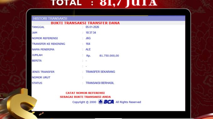 NAGA303 mengucapkan selamat kepada user id : ALE*** yang telah berhasil mendapatkan jackpot pada permainan LIVE CASINO DI HEAD TAIL. Kemenangan sebesar Rp 81.750.000,-. telah dibayarkan LUNAS oleh pihak naga303 kepada pemilik user id setelah yang bersangkutan mengisi formulir withdraw. Proses pencairan dana berlangsung sangat cepat hanya dalam waktu 6-11 menit sudah berada dalam rekening pemilik user id. Bukti transfer yang dapat anda lihat adalah bukti SAH / VALID yang langsung di dapatkan melalui bukti transaksi dari Bank yang digunakan untuk pengiriman dana pada rekening pemilik user id. Terima kasih kami sampaikan kepada para pengguna setia naga303 yang telah menggunakan situs kami, sebagai Bandar Terpercaya yang pastinya membayar semua kemenangan member hingga lunas. Apakah Naga303 PENIPU ? Reputasi “NAGA303 TERPERCAYA” sudah sangat melekat. puluhan hingga ratusan ribu pengguna setia NAGA303 tetap menggunakan situs terbesar dan terbaik di Indonesia ini. Hapus rasa was-was dan khawatir anda, kemenangan anda berapapun PASTI dibayarkan hingga lunas.