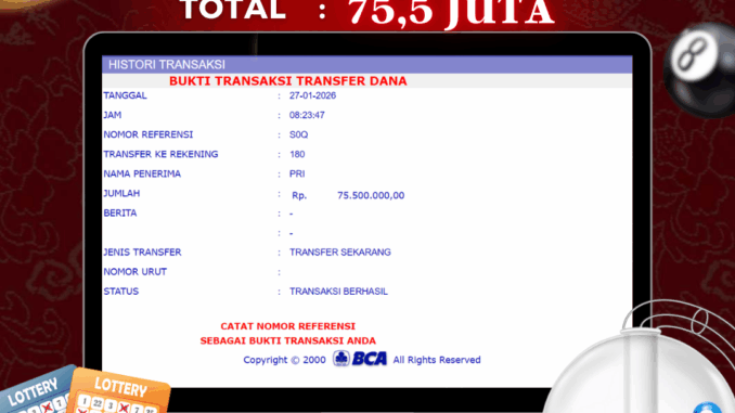 NAGA303 mengucapkan selamat kepada user id : JON*** yang telah berhasil mendapatkan jackpot pada permainan TOGEL DI AMAZON 3D. Kemenangan sebesar Rp 75.500.000,-. telah dibayarkan LUNAS oleh pihak naga303 kepada pemilik user id setelah yang bersangkutan mengisi formulir withdraw. Proses pencairan dana berlangsung sangat cepat hanya dalam waktu 6-11 menit sudah berada dalam rekening pemilik user id. Bukti transfer yang dapat anda lihat adalah bukti SAH / VALID yang langsung di dapatkan melalui bukti transaksi dari Bank yang digunakan untuk pengiriman dana pada rekening pemilik user id. Terima kasih kami sampaikan kepada para pengguna setia naga303 yang telah menggunakan situs kami, sebagai Bandar Terpercaya yang pastinya membayar semua kemenangan member hingga lunas. Apakah Naga303 PENIPU ? Reputasi “NAGA303 TERPERCAYA” sudah sangat melekat. puluhan hingga ratusan ribu pengguna setia NAGA303 tetap menggunakan situs terbesar dan terbaik di Indonesia ini. Hapus rasa was-was dan khawatir anda, kemenangan anda berapapun PASTI dibayarkan hingga lunas.
