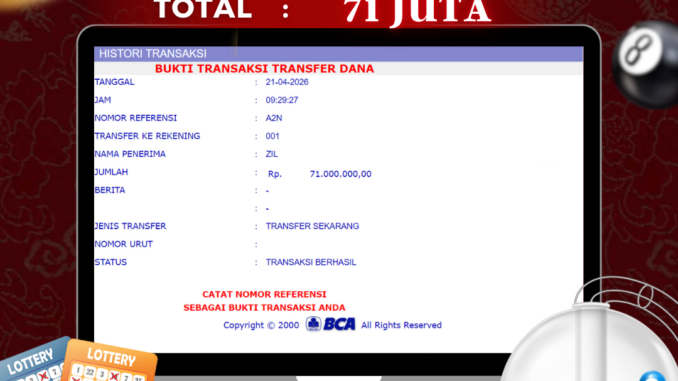 NAGA303 mengucapkan selamat kepada user id :JAY*** yang telah berhasil mendapatkan jackpot pada permainan TOGEL DI JOWOPOOLS. Kemenangan sebesar Rp 71.000.000,-. telah dibayarkan LUNAS oleh pihak naga303 kepada pemilik user id setelah yang bersangkutan mengisi formulir withdraw. Proses pencairan dana berlangsung sangat cepat hanya dalam waktu 6-11 menit sudah berada dalam rekening pemilik user id. Bukti transfer yang dapat anda lihat adalah bukti SAH / VALID yang langsung di dapatkan melalui bukti transaksi dari Bank yang digunakan untuk pengiriman dana pada rekening pemilik user id. Terima kasih kami sampaikan kepada para pengguna setia naga303 yang telah menggunakan situs kami, sebagai Bandar Terpercaya yang pastinya membayar semua kemenangan member hingga lunas. Apakah Naga303 PENIPU ? Reputasi “NAGA303 TERPERCAYA” sudah sangat melekat. puluhan hingga ratusan ribu pengguna setia NAGA303 tetap menggunakan situs terbesar dan terbaik di Indonesia ini. Hapus rasa was-was dan khawatir anda, kemenangan anda berapapun PASTI dibayarkan hingga lunas.